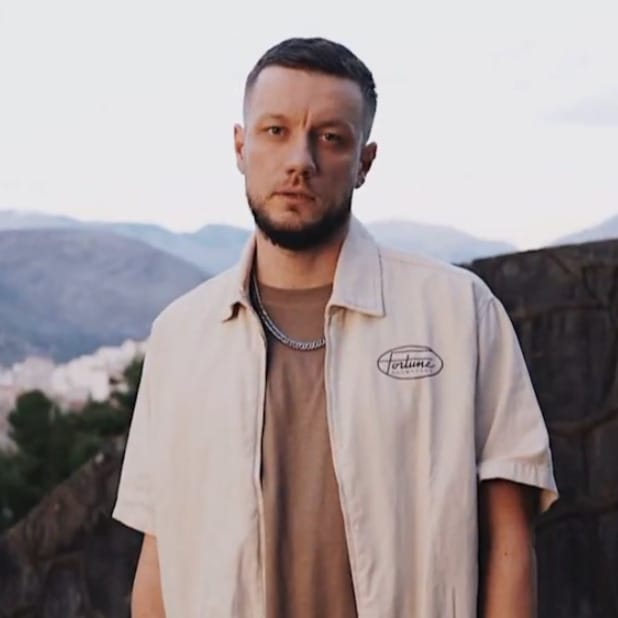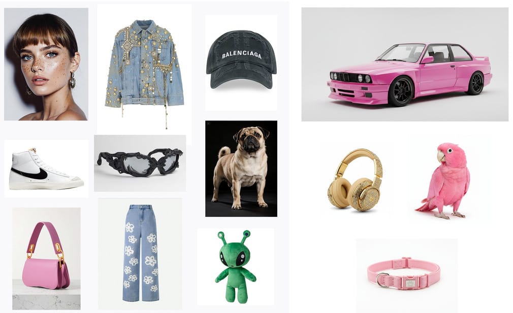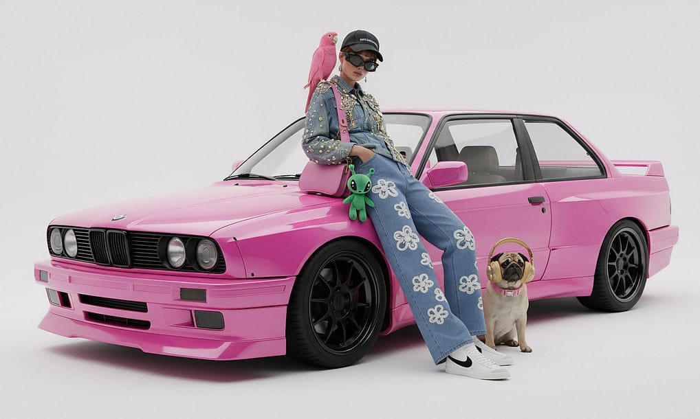 Một người mẫu đang tạo dáng và tựa vào một chiếc BMW màu hồng. Cô ấy mặc những món đồ sau, bối cảnh được đặt trên nền xám nhạt. Người ngoài hành tinh màu xanh lá cây là một chiếc móc khóa được gắn vào chiếc túi xách màu hồng. Người mẫu cũng có một con vẹt màu hồng trên vai. Có một chú chó pug ngồi cạnh cô ấy, đeo vòng cổ màu hồng và tai nghe màu vàng.