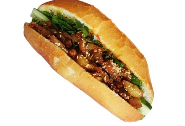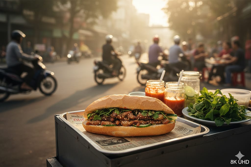 Một quảng cáo siêu thực về Bánh mì thịt được đặt trên một xe bán đồ ăn đường phố nhỏ ở Việt Nam. Chiếc bánh mì nằm trên một khay kim loại đơn giản được lót bằng những tờ báo cũ. Xung quanh là những lọ tương ớt, dưa chuột muối và rau thơm tươi. Ở hậu cảnh mờ, bạn có thể thấy xe máy đi qua, mọi người đang thưởng thức bữa sáng, và ánh nắng ban mai ấm áp chiếu trên đường phố. Chiếc bánh mì trông giòn vàng, với những lát thịt heo, ớt và rau củ tràn ra tự nhiên. Ánh sáng điện ảnh, kết cấu HDR, phong cách quảng cáo thao tác ảnh. Bầu không khí chân thực, hoài cổ và gần gũi với đời sống hàng ngày của người Việt.