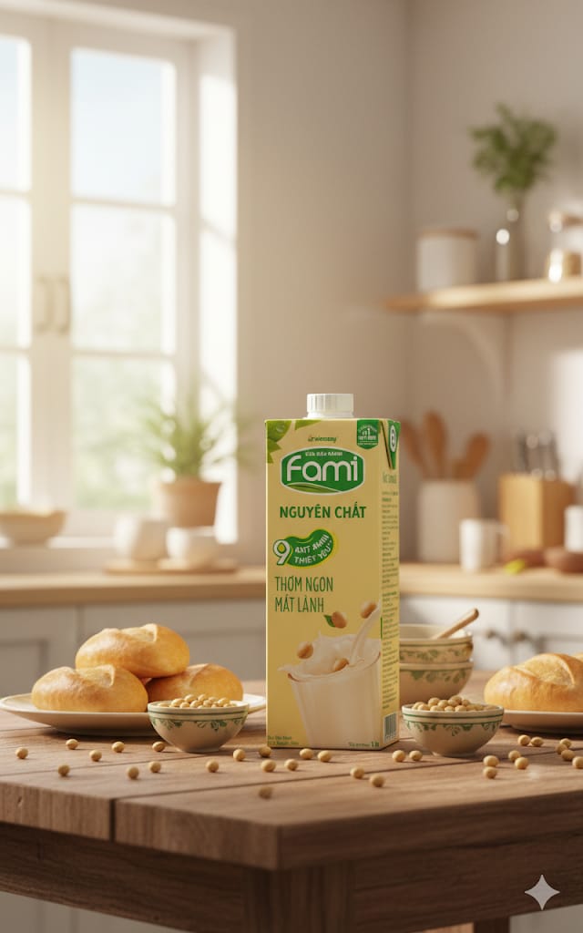 Một bức ảnh quảng cáo phong cách sống điện ảnh, siêu thực của một hộp sữa đậu nành Fami được đặt trên bàn ăn bằng gỗ bên trong một nhà bếp Việt Nam tươi sáng. Ánh nắng ban mai chiếu nhẹ qua cửa sổ, tỏa ánh sáng tự nhiên ấm áp khắp khung cảnh. Xung quanh sản phẩm là những chiếc bát nhỏ, một đĩa bánh mì và những hạt đậu nành tươi được rắc nhẹ nhàng. Bố cục gợi lên sự ấm áp, gắn kết gia đình và lối sống lành mạnh. Bao bì, văn bản và logo của sản phẩm Fami phải được giữ nguyên một cách hoàn hảo với độ sắc nét. Hậu cảnh được làm mờ nhẹ để tạo độ sâu trường ảnh, tông màu điện ảnh, chỉnh màu ấm, bố cục theo phong cách quảng cáo, kết cấu siêu chi tiết, 8K UHD.