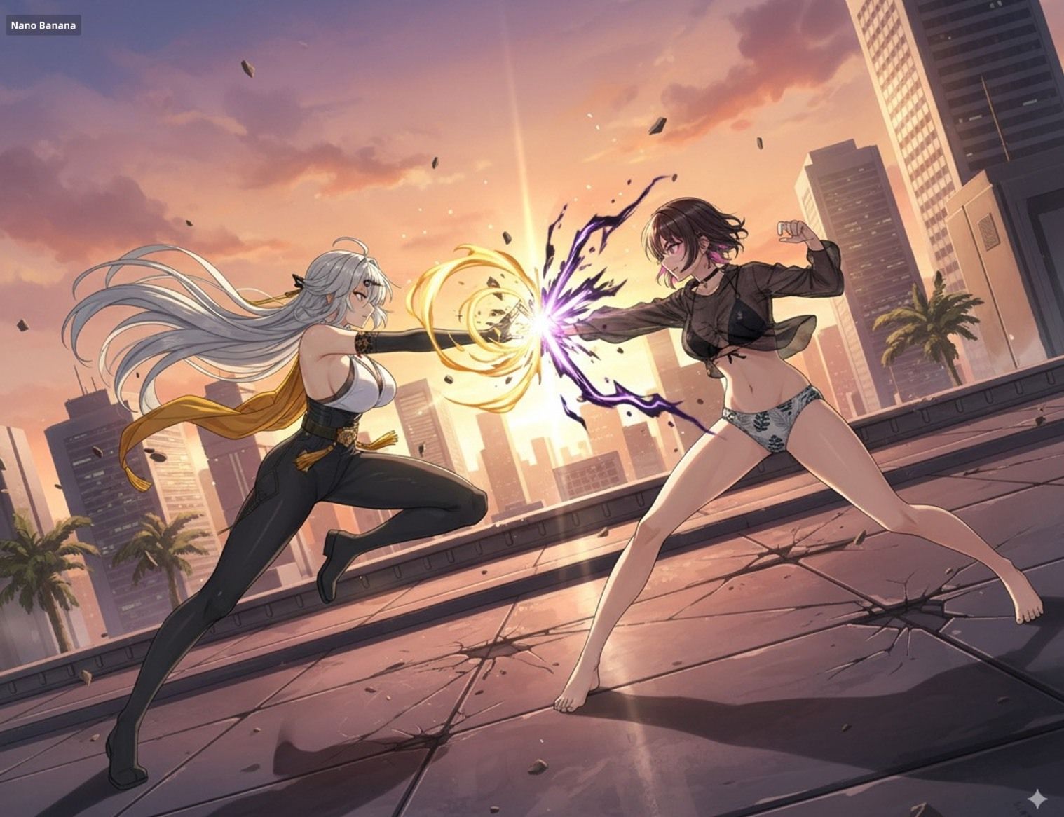 Để hai nhân vật này chiến đấu theo tư thế từ Hình 3. Thêm hình nền trực quan và tương tác cảnh thích hợp, Tỷ lệ hình ảnh được tạo là 16:9