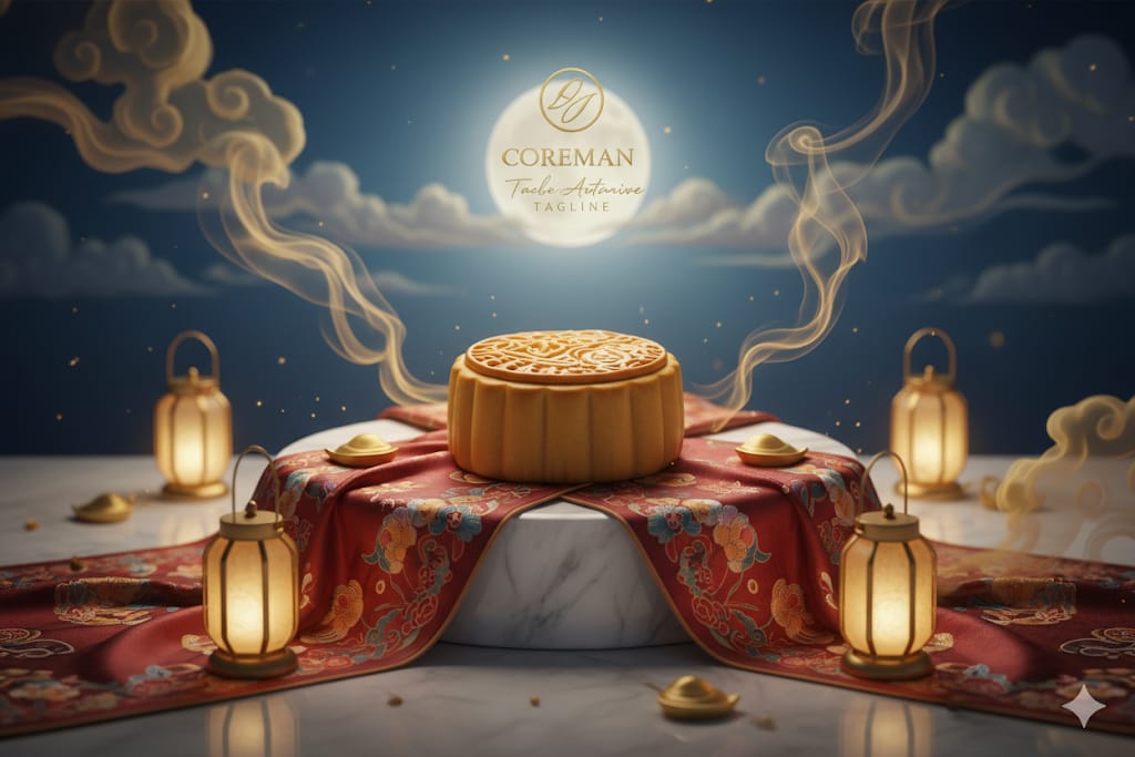 Chiếc bánh trung thu nằm trên tấm vải lụa thêu sang trọng màu đỏ và vàng, được đặt trang nhã trên bệ đá cẩm thạch trắng.
