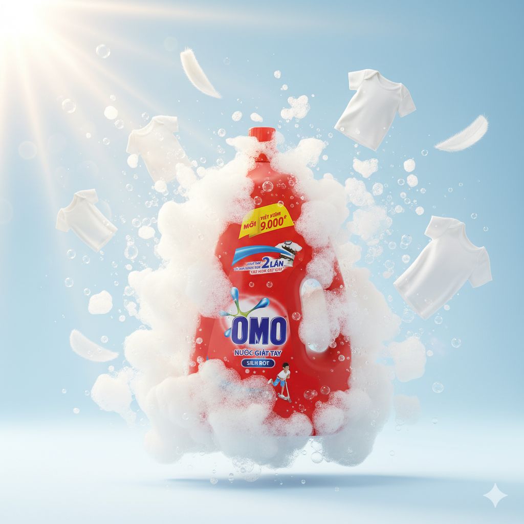 Một quảng cáo sản phẩm siêu thực của Bột giặt bọt thông minh OMO, bùng nổ với sự bùng nổ mạnh mẽ của bọt xà phòng trắng và nước bắn tung tóe trong như pha lê.