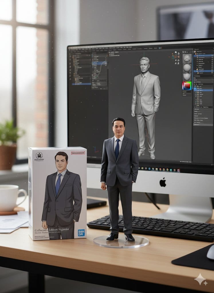 "Tạo một mô hình figure thương mại hóa tỷ lệ 1/7 của các nhân vật trong ảnh, theo phong cách tả thực, trong một bối cảnh thực tế. Các figure được đặt trên một chiếc bàn máy tính. Figure có đế tròn bằng acrylic trong suốt, trên đế không có chữ. Nội dung trên màn hình máy tính là quá trình điêu khắc mô hình của figure này bằng Zbrush. Bên cạnh màn hình máy tính là một hộp đồ chơi theo phong cách BANDAI được in artwork gốc. Bao bì có các hình minh họa phẳng, hai chiều."