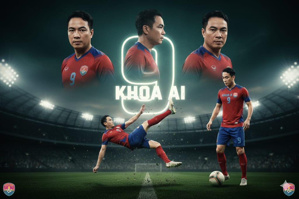 Tạo một poster bóng đá chuyên nghiệp theo phong cách điện ảnh có hình ảnh [đã được tải lên]. Giữ nguyên khuôn mặt, mái tóc, hình dáng và góc độ chính xác như trong ảnh gốc. Thể hiện nhân vật ở ba góc nhìn: một ảnh chân dung siêu cận cảnh mặc áo đấu [đã được tải lên], một ảnh nhìn nghiêng mặc áo đấu tải lên với tên KHOA AI ở sau lưng, và một ảnh toàn thân trong bộ trang phục thi đấu bóng đá đầy đủ (áo đấu, quần đùi, tất và giày) có logo của đội banh tôi tải lên. Ở phía dưới, hãy đặt một cảnh hành động sống động của cầu thủ đang thực hiện một cú tung người móc bóng (xe đạp chổng ngược) mạnh mẽ với hiệu ứng chuyển động mờ và cỏ bay xung quanh. Áo đấu phải hiển thị rõ số 9 ở mặt trước, mặt sau và trên quần. Sử dụng nền sân vận động màu xanh đậm ấn tượng với số 9 lớn và tên 'KHOA AI' phát sáng phía sau nhân vật. Phong cách tổng thể phải siêu thực, độ phân giải cao, đậm chất điện ảnh và chuyên nghiệp như poster thể thao."