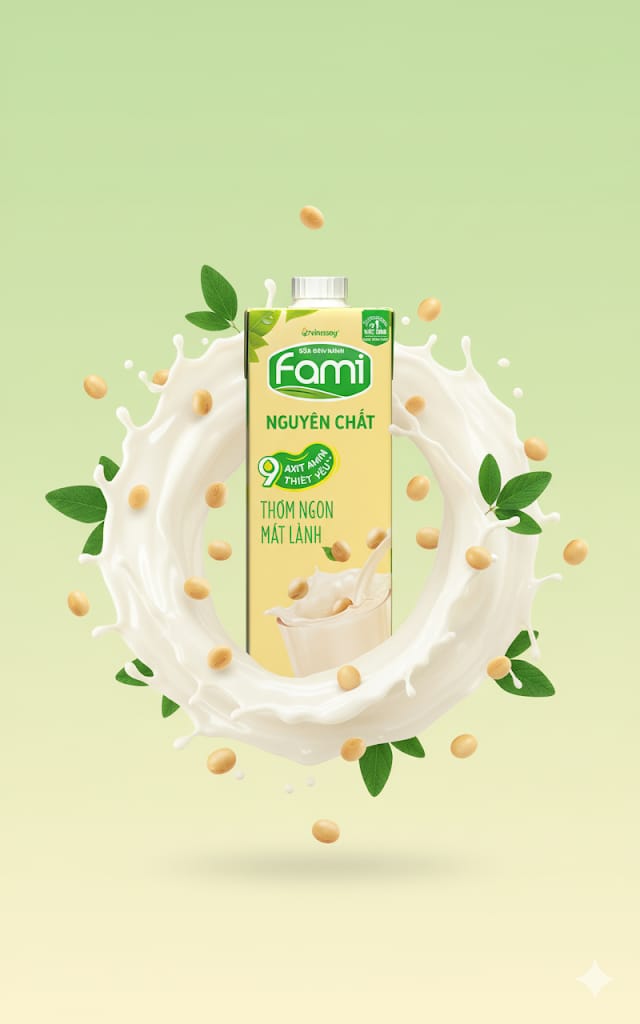 Hộp sữa đậu nành Fami đặt chính giữa, bao quanh là hạt đậu nành vàng óng, lá xanh và splash sữa trắng bay trong không trung. Nền gradient vàng nhạt – xanh lá. Ánh sáng studio sáng, phản chiếu sắc nét. Phong cách hyper-realistic, 3D beverage ad, trẻ trung và tươi mới.